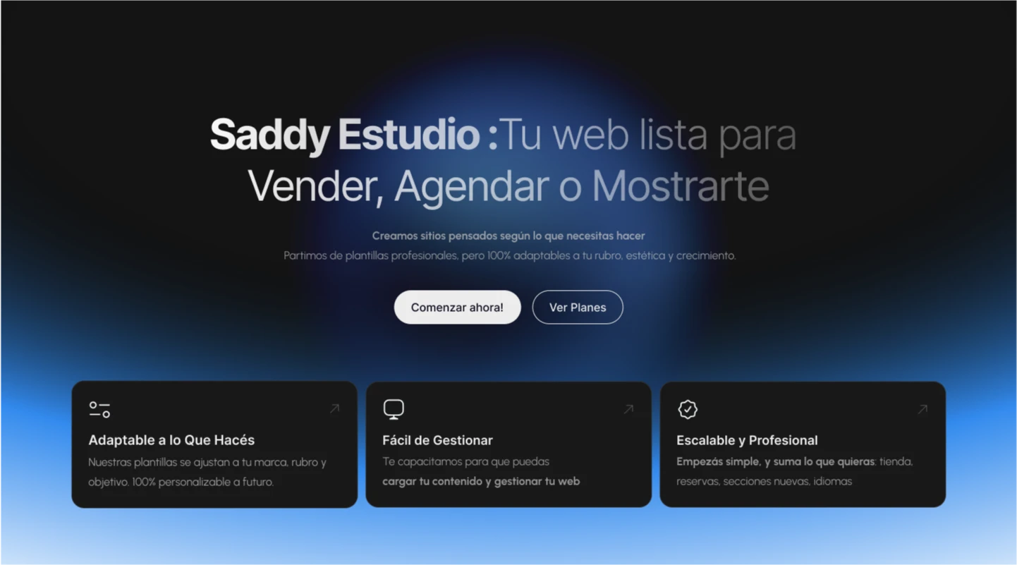 En Saddy Estudio creamos mas que soluciones digitales. Somos un equipo especializado en diseño y desarrollo web profesional, enfocados en ofrecer sitios personalizados, optimizados y con identidad . Nuestra misión es acompañarte en cada etapa, generando resultados reales para tu negocio.